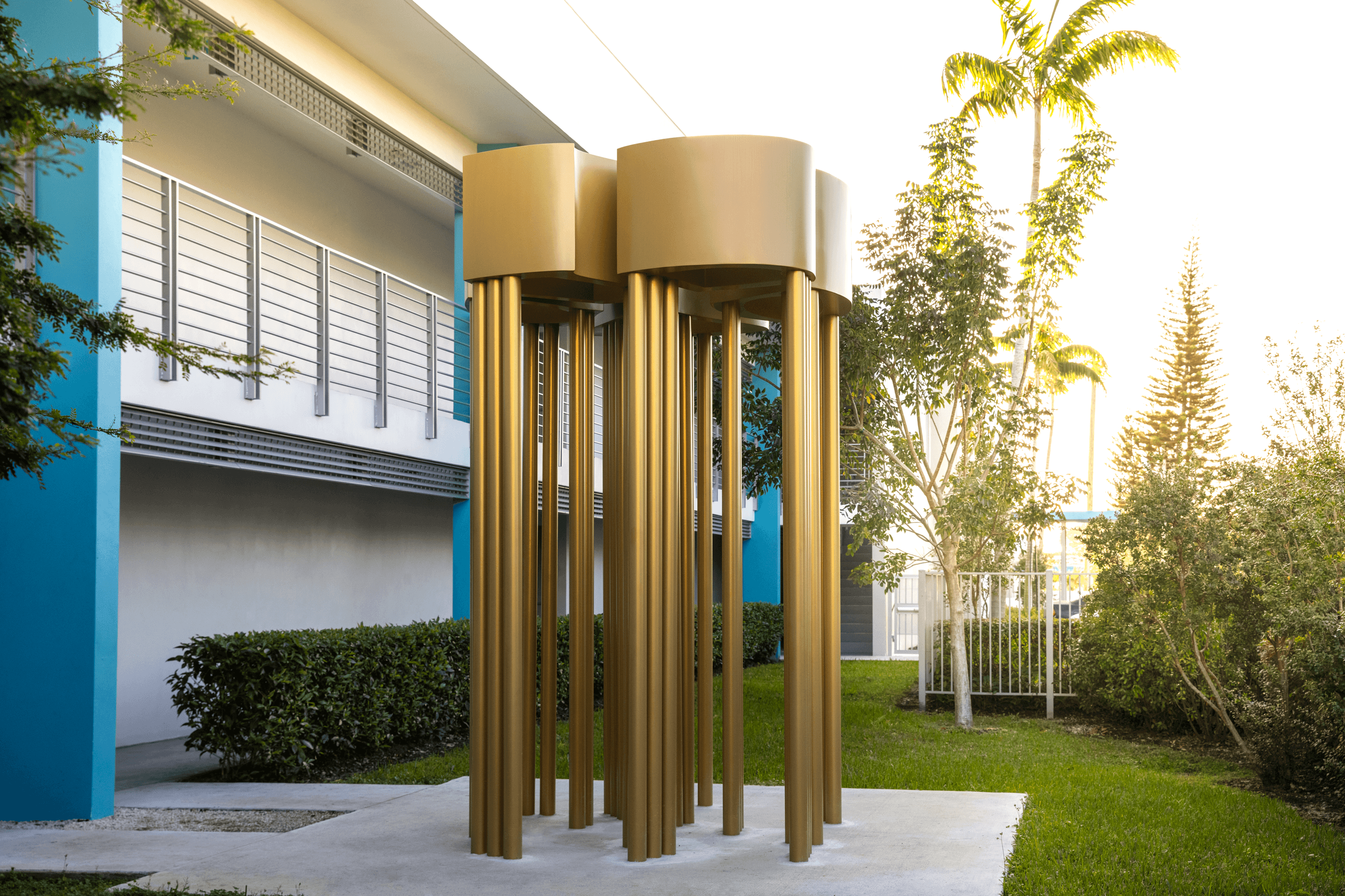 Miami-based artist Felice Grodin created Cosmic Tree, a striking freestanding sculpture for Senator Villas, a Miami-Dade County senior housing facility. Fabricated by United America Metal Works using precision-cut aluminum, the piece forms an organic, tree-like structure that evokes interconnected roots and branches—symbolizing renewal, community, and harmony with nature in a serene garden setting.